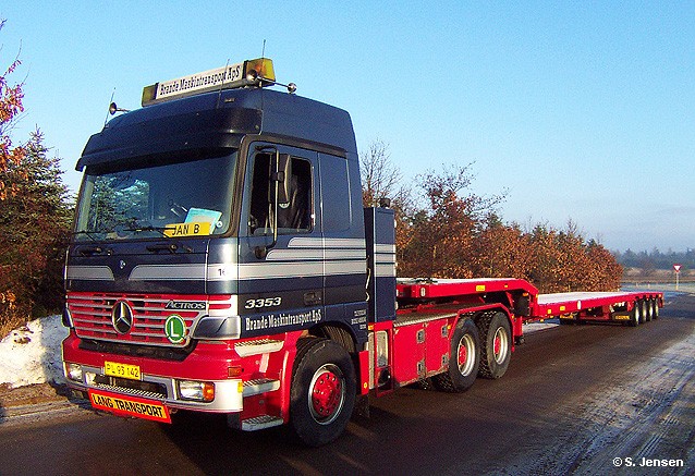 Im winterlichen Testeinsatz zeigt sich hier ein dänischer Spezialtransporter, ein Actros mit knapp 16 Liter großem V8-Triebwerk.